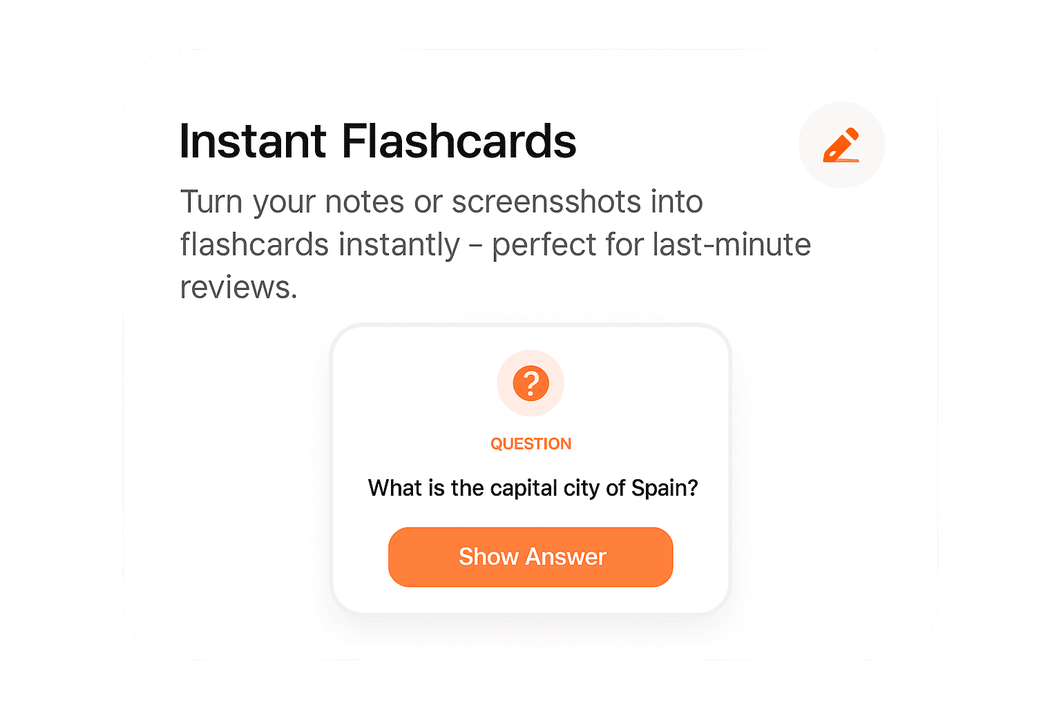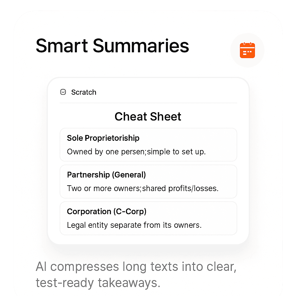 Instantly turn your notes into flashcards, summaries, and quizzes - right before your test.